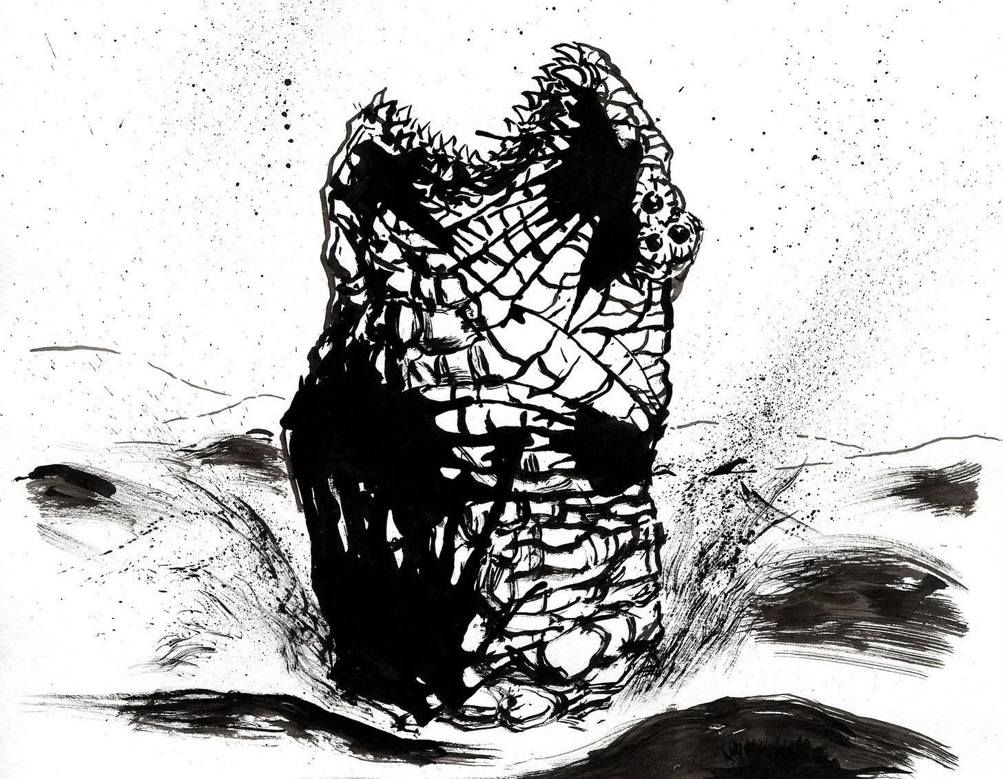 They soon encountered another pair of granite statues on Heqeti plinths. The statue to the northwest was a female Rudishvan wearing a close fitting unigarment and some for of ear protectors on. She stood in a thoughtful pose, looking into the distance. Glyphic runes were carved into her left foot. The statue on the southeastern side was badly corroded by water and worse, and was only barely recognizable as having once been similar to its companion.